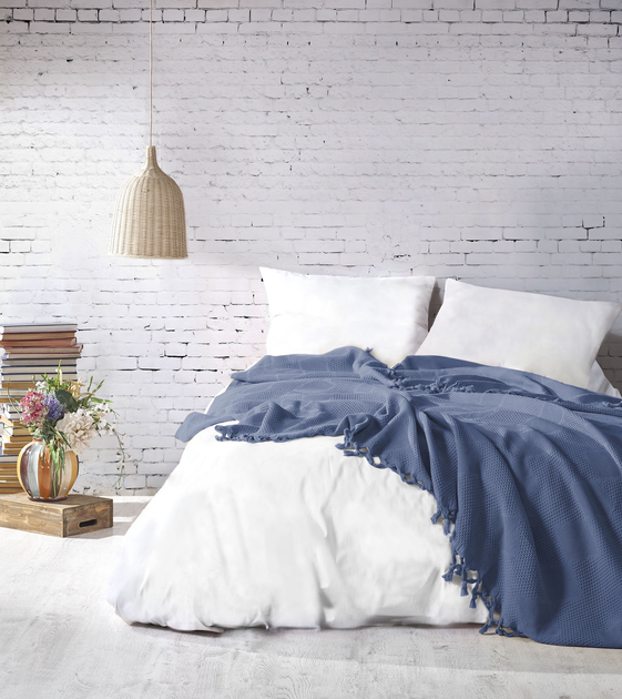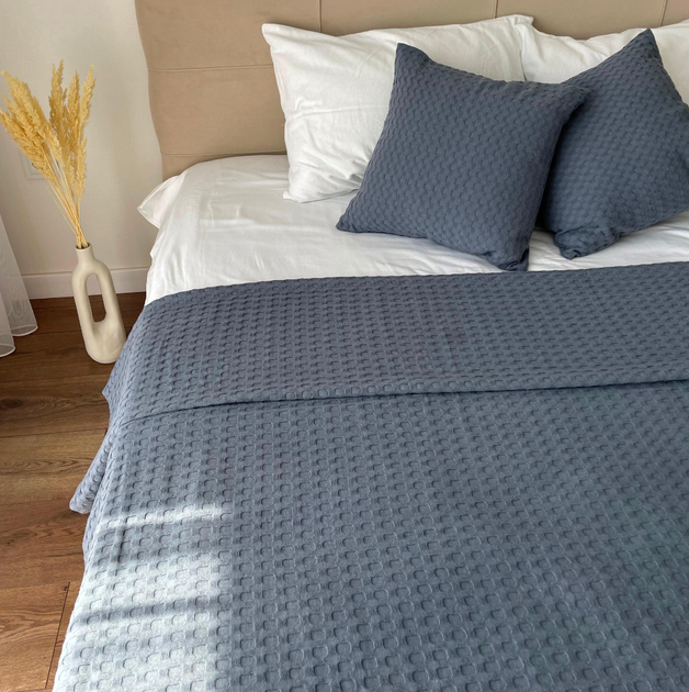 Вафельне плед покривало LavSon 100 органічна бавовна Односпальний 150х220 + 2 наволочки 45х45 Синій