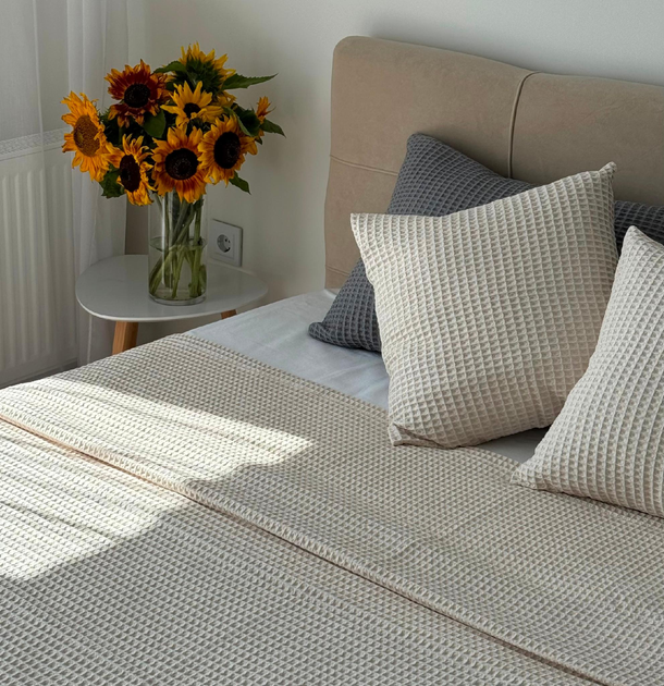 Вафельне плед покривало LavSon 100 органічна бавовна Односпальний 150х220 + 2 наволочки 45х45 Кремовий