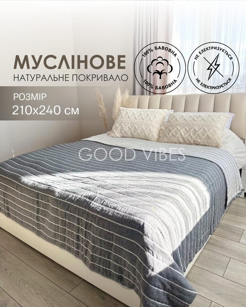 Муслінове покривало бавовняне двостороннєв полоску темно-сіре з білим євро 210x240 см (MAL006)