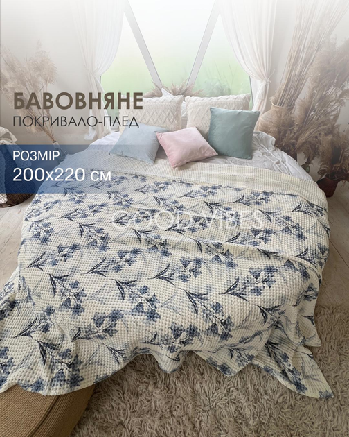 Натуральне покривало-плед бавовняне молочне з квітковим синім візерунком FLORAL DREAM євро 200х220 см (FL02)