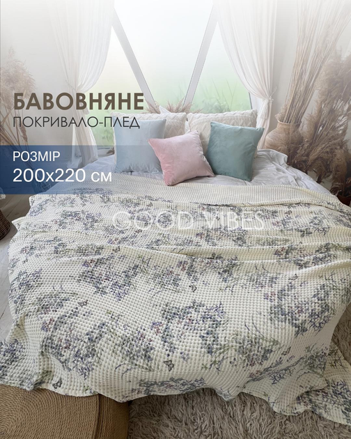 Натуральне покривало-плед бавовняне молочне з квітковим літнім візерунком FLORAL DREAM євро 200х220 см (FL03)