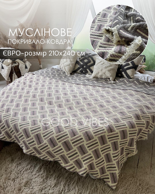 Бавовняне натуральне покривало ковдра муслін двостороннє візерунок геометрія кольору сірий та лаванда 210х240 см (COL002)