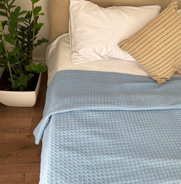 Вафельне плед покривало LavSon 100 органічна бавовна Двоспальний 220х220 + 2 наволочки 50х70 Блакитний