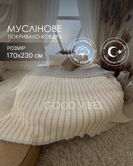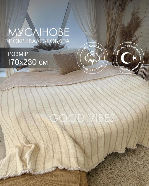 Муслінове півтораспальне покривало ковдра бавовняне двостороннє в полоску бежевого кольору 170х230 см Moss Home (MUS00661)