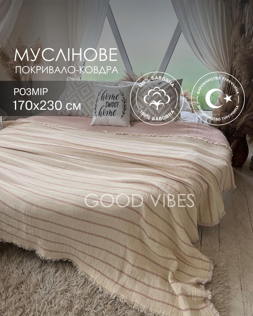 Муслінове півтораспальне покривало ковдра бавовняне двостороннє в полоску пудрового кольору 170х230 см Moss Home (MUS00101)