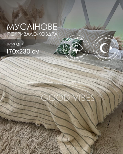 Муслінове півтораспальне покривало ковдра бавовняне двостороннє в полоску оливкового кольору 170х230 см Moss Home (MUS0021)