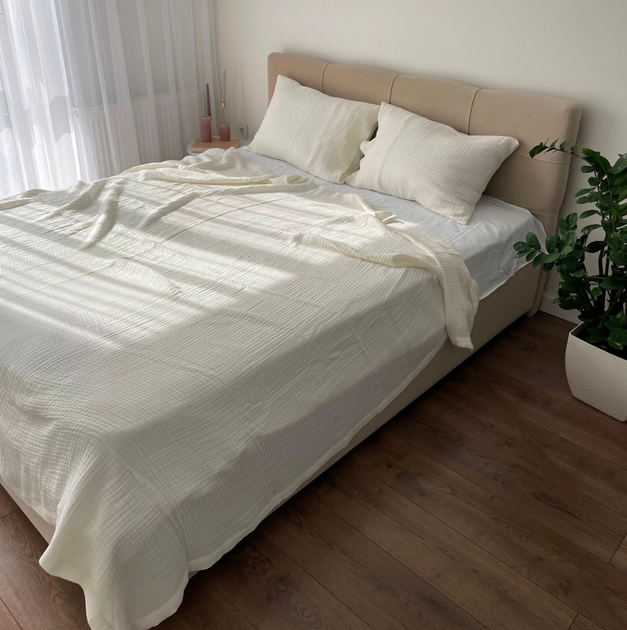 Плед покривало Муслін 4-х шаровий LavSon 100 органічна бавовна Євро 260х240 + 2 наволочки 50х70 молочний