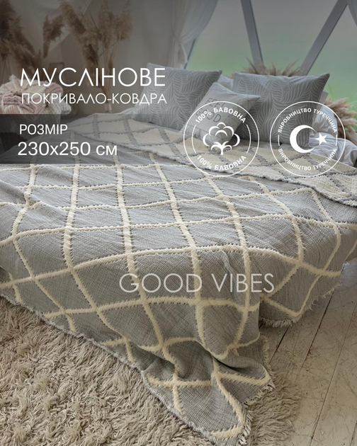 Муслінове покривало ковдра бавовняне двостороннє візерунок ромб сірого кольору 230х250 см Moss Home (MUS007)