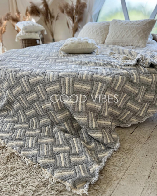 Покривало-плед жакардове з мусліну 100 бавовна 230х250 см двостороннє сіро-молочне з геометричним візерунком Moss Home (MUS0