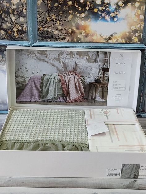 Покривало вафельне піке Pupilla Monica yesil з простирадлом та наволочками