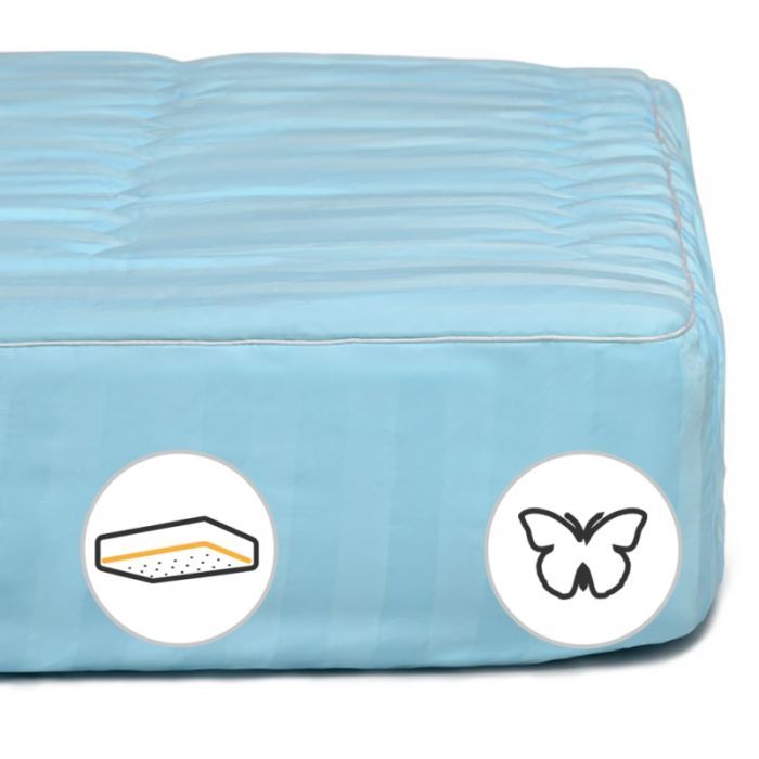 Двосторонній наматрацник, що не промокає, на гумці по кутах з високоякісної італійської тканини. З одного боку легка тканина мікросатин, яка забезпечить потрібну прохолоду у спекотні літні ночі, з іншого боку 100% бавовняна тканина - сатин, яка забезпечит