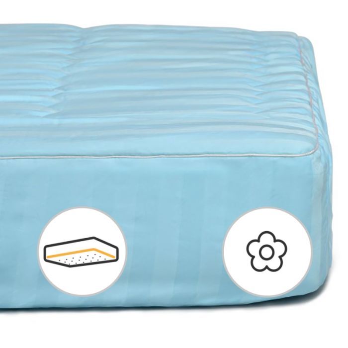 Розмір - 90 x 190 см, кріплення - з гумкою уздовж периметру, наповнювач - 70% бавовна, 30% поліефірний розпушувач, сатин жакард