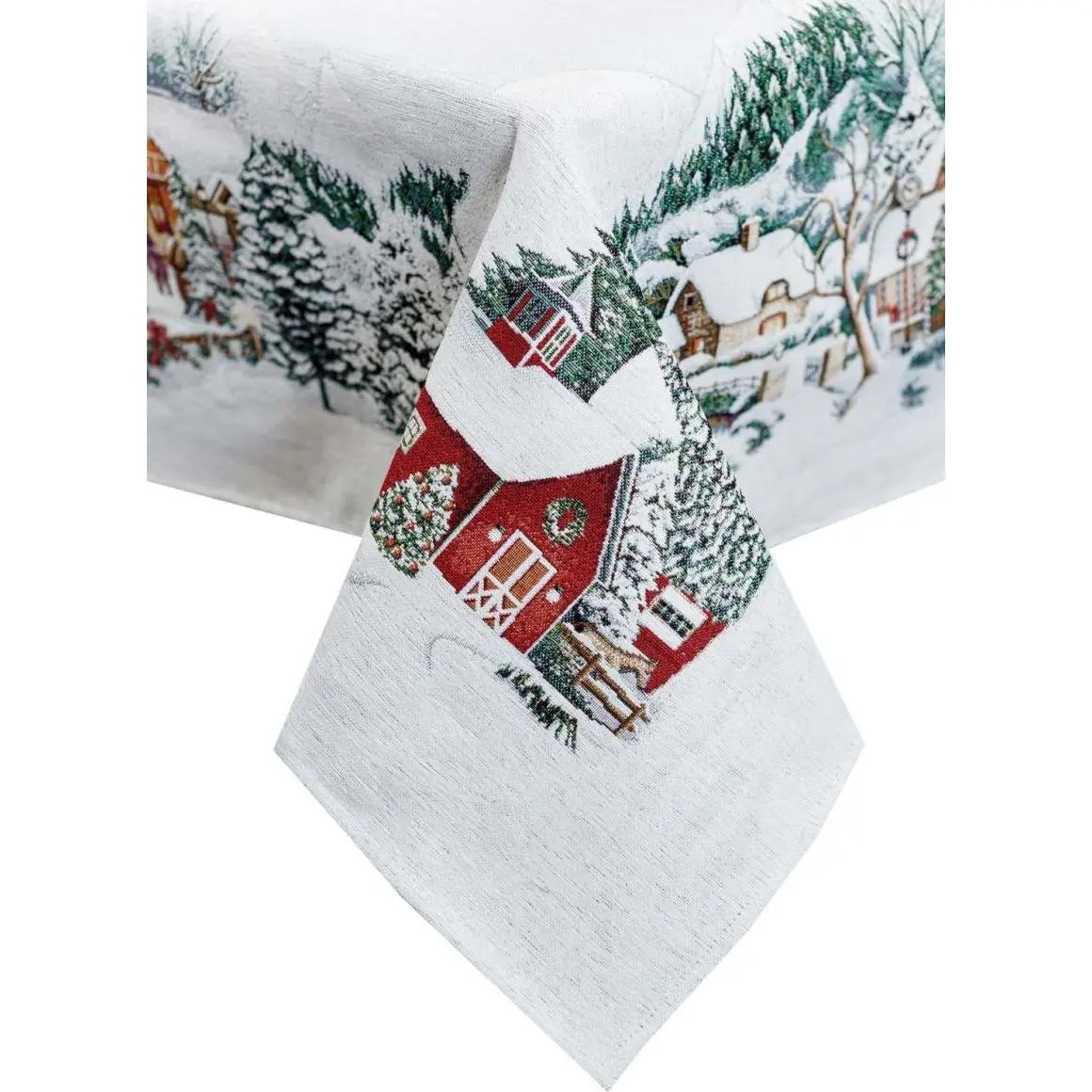 Скатертина гобеленова з велюром Прованс Зимове місто 180х135 см біла (31293)