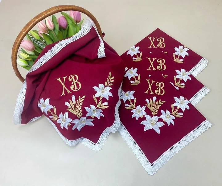 Серветка декоративна з вишивкою Family Tradition сатинова 60х60 см яскраво-бордова До свята Великодня