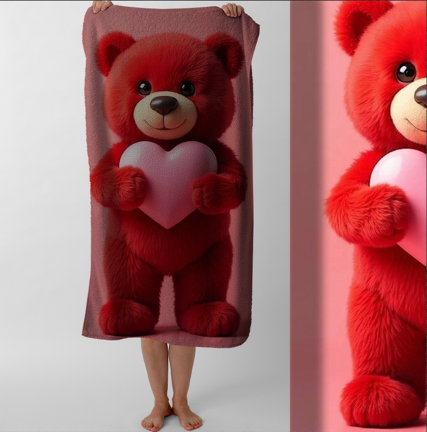 Рушник Червоний ведмедик з серцем валентинка банний пляжний 70х150 см
