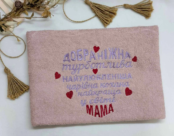 Махровий рушник з вишивкою "Добра ніжна мама" 50х90 см рожевий Kuzka