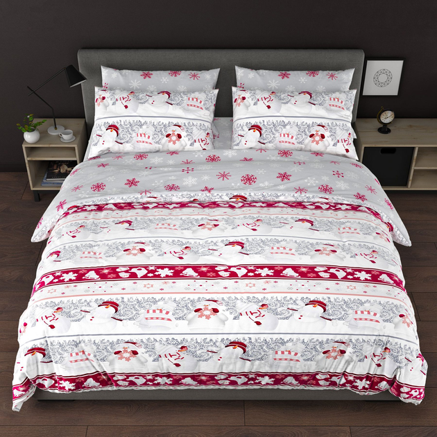 Постільна білизна новорічна двоспальна світло-сіра Новорічні Сніговички Бязь Голд Ananasko 518100