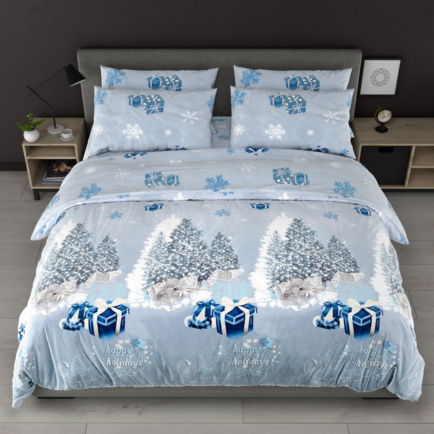 Постільна білизна новорічна двоспальна блакитна Новорічні ялинки Бязь Голд Ananasko 518110
