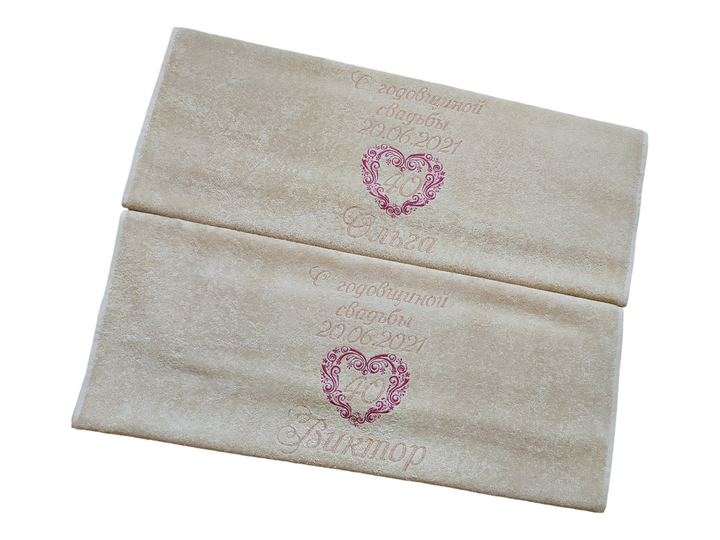 Набор рушників махровий банний 70*140 бежевий з іменною вишивкою Ольга Віктор на річницю весілля (00158)