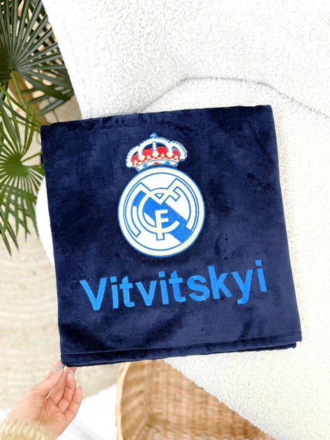 Банний рушник Family Tradition велюрова махра з вишивкою 140х70 см темно-синій Фанат Real Madrid