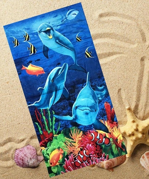 Пляжний велюровий рушник покривало з бавовни 140х75 см принт дельфін та підводний світ