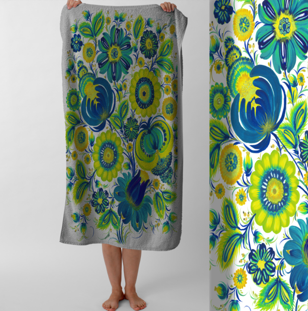Рушник Жовто блакитні квіткові орнаменти петриківський розпис банний пляжний 70х150 см