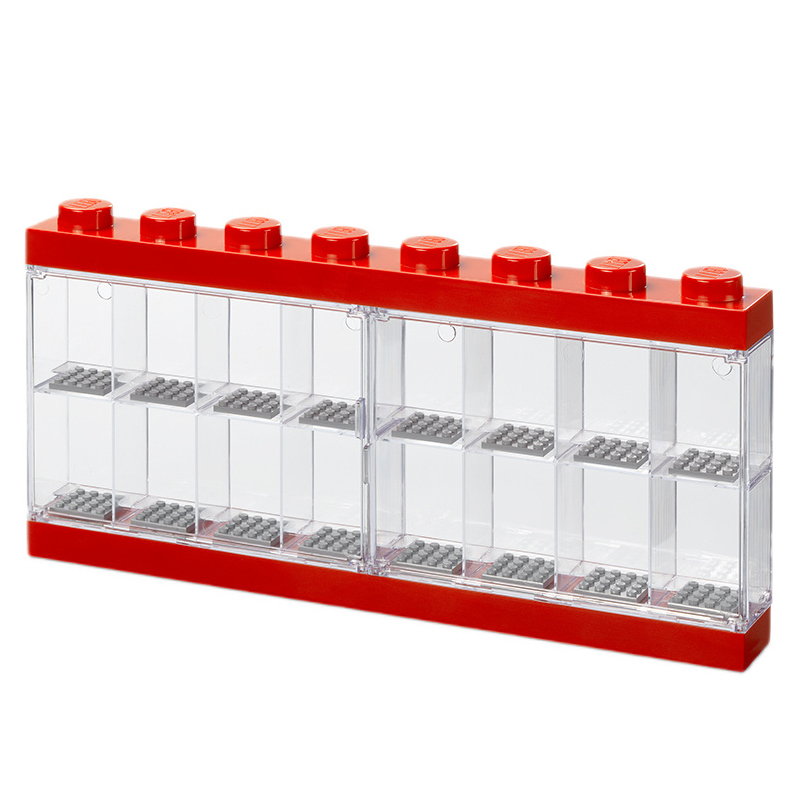 Дисплей для мініфігурок LEGO Lifestyle 16 — практичний та місткий прозорий дисплей із двома дверцятами охайно демонструє колекцію та захищає її від пилу й випадкових пошкоджень. Усередині — два рівні індивідуальних відсіків з окремими сірими базовими пластинами LEGO для надійної фіксації фігурок. Корпус виконаний у червоному кольорі; зверху розміщені збільшені шипи LEGO, завдяки яким