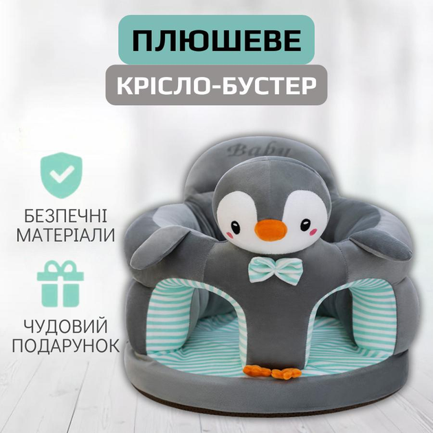 Дитяче плюшеве сидіння-бустер у вигляді тваринки м'яке крісло з бортиками пінгвін сірий (280038М)