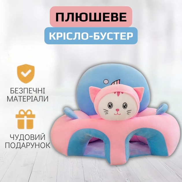 Дитяче плюшеве сидіння-бустер у вигляді тваринки м'яке крісло з бортиками котик блакитно-рожевий (280047М)