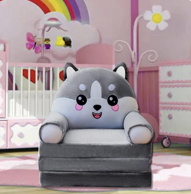 М'яке крісло дитяче Хаскі з великими очима 50 см, плюшеве м'яке крісло для дітей, Сірий