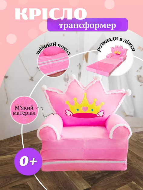 Плюшеве розкладне крісло-ліжко для дітей у вигляді корони диванчик трансформер 2 в 1 для дівчат рожевий (280024М)