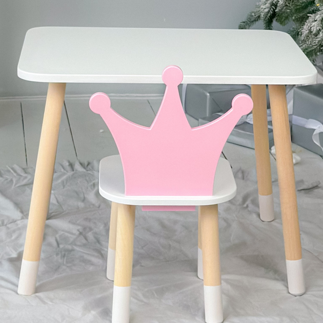 Дитячий білий прямокутний стіл 46х60х40 і стільчик корона 26.5х26х25 набір меблів для ігор, білий з рожевим