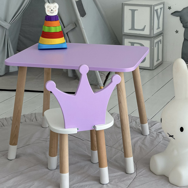 Дитячий столик з дерева 46х60х45 і стільчик спинка в виді корони 26.5х26х25, стіл та стілець для дівчинки, фіолетовий з біли