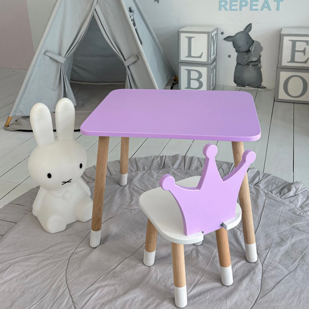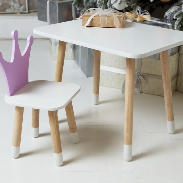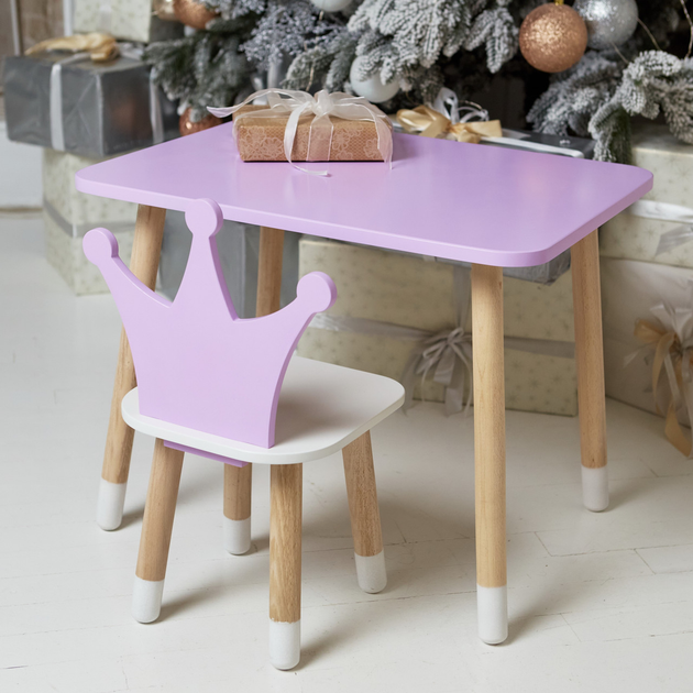 Дитячий прямокутний стіл та стільчик з короною фіолетового кольору з натурального дерева