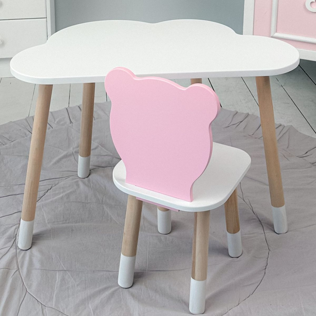 Дитячи білосніжний стіл хмарка і стільчик ведмедик дитячий рожевий LalaKids 700 мм