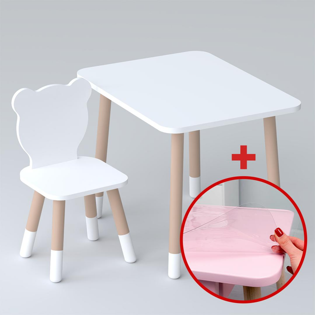 Набір дитячих меблів стіл прямокутний 46х60х45 та стілець ведмежа 26.5х26х25 білий / столик та стільчик до 7 років + захисне