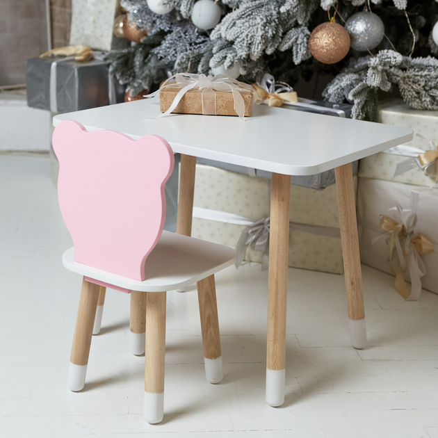 Білий прямокутний столик і стільчик дитячий рожевий ведмежа з білим сидінням