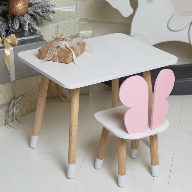 Білий прямокутний столик та стільчик дитячий рожевий метелик з білим сидінням