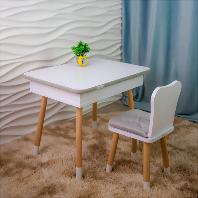 Дитячий стіл з пеналом + стілець з м'якою подушкою для сидіння Білий з сірою окантовкою
