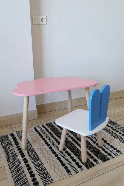 Комплект стіл та стілець дитячий ChildWood - Set Стіл розовий хмарина + стілець білий блакитний Зайчик (Фанера)
