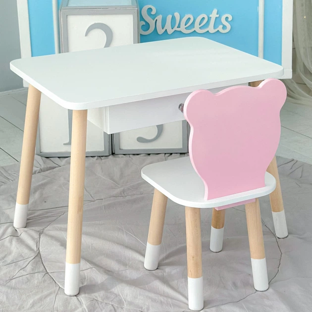 Дитячий столик із шухлядою 46х60х45 і сидіння медведик, стіл та стілець для дитячої кімнати, біло-рожевий