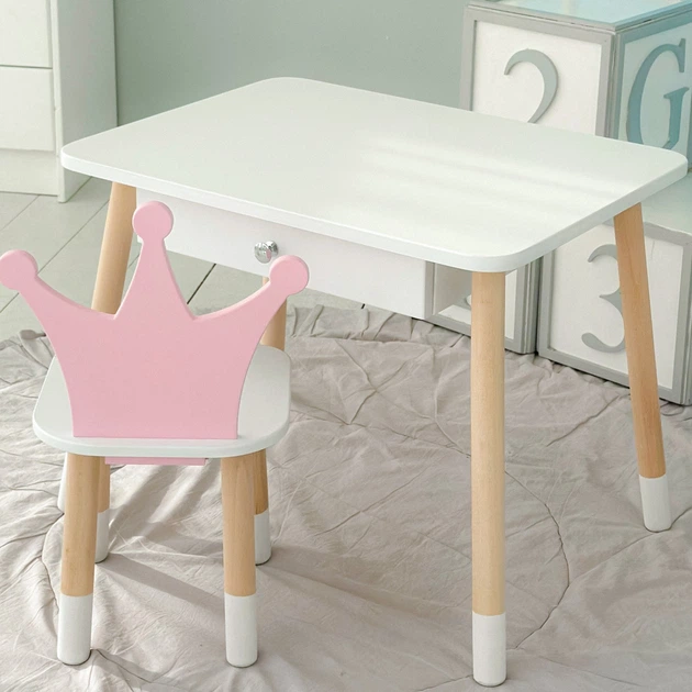 Столик з ящиком 46х60х45 та стільчик корона 26.5х26х25, стіл та стілець для дівчинки, рожевий з білим