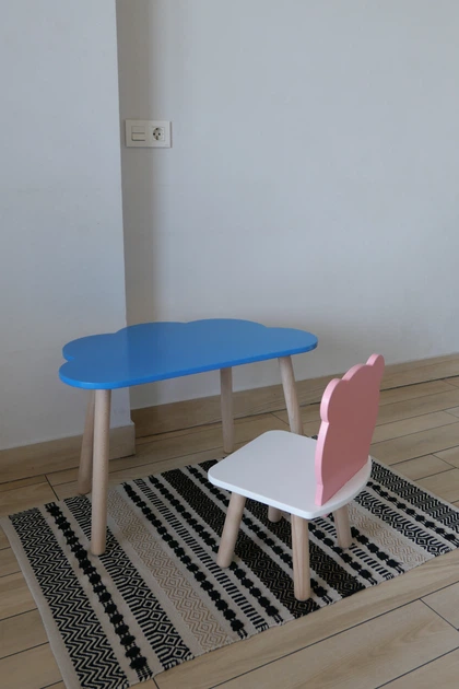 Комплект стіл та стілець дитячий ChildWood - Set Стіл блакитний хмаринка + стілець білий рожевий Мишка (Фанера)