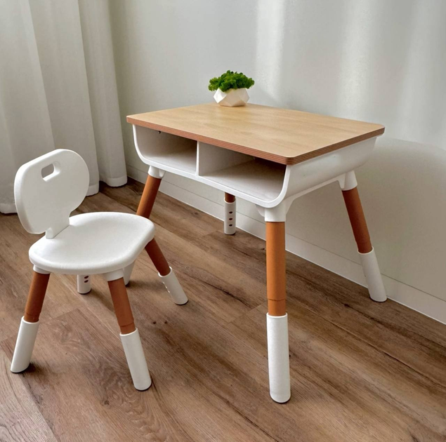 Столик зі стільцем в скандинавському стилі для навчання з поличками та органайзерами, 2-7 років дитячий дерев'яний регульова