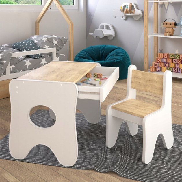 Набір дитячих меблів столик з ящиком та стільчик 704551, стіл та стілець для дітей, білий з деревом