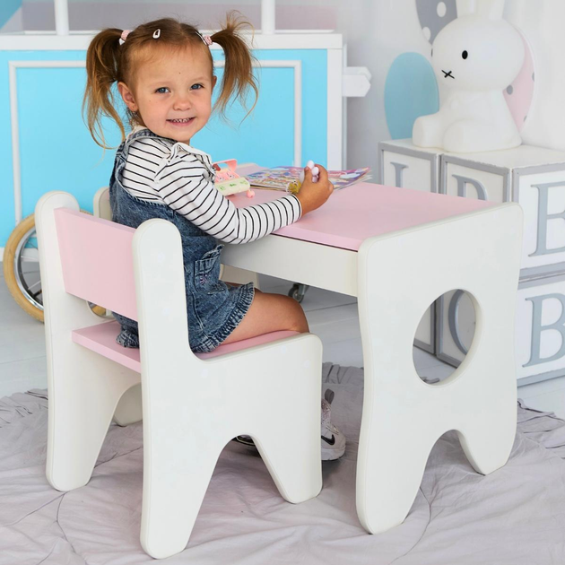 Столик та стільчик для дитини, дитячий гральний стіл та стілець, білий з рожевим