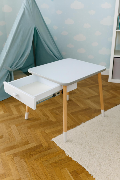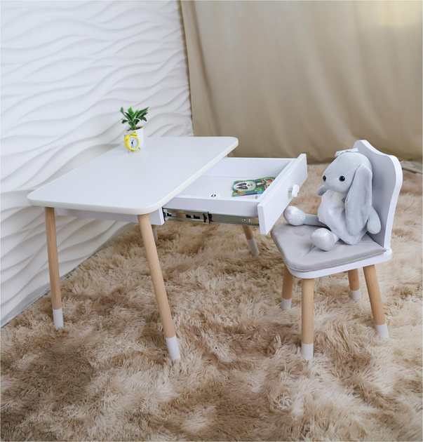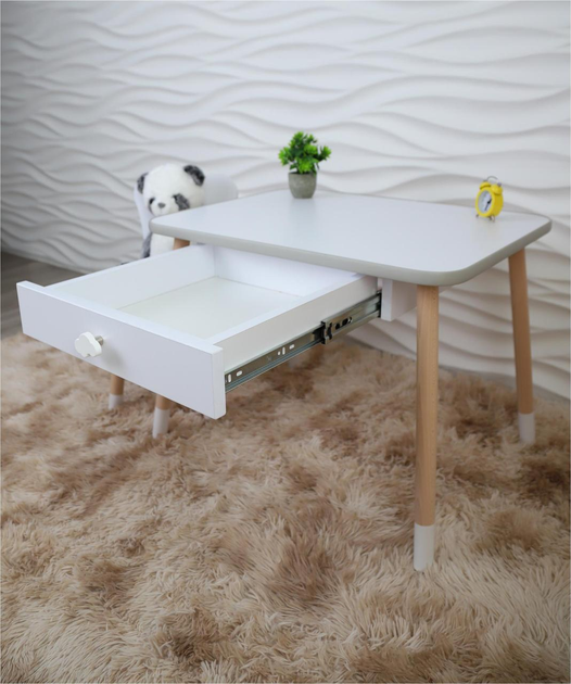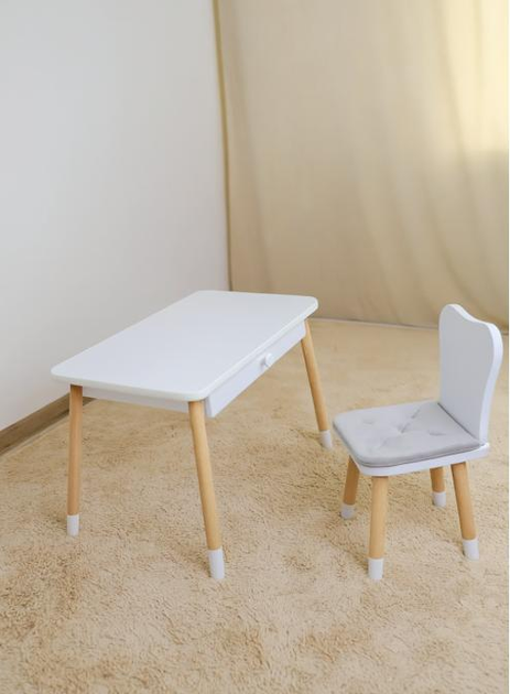 Стіл дитячий з шухлядою і стільчиком з натурального дерева білий для дитини 1–7 років із сірою окантовкою