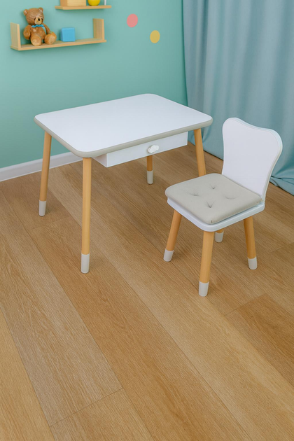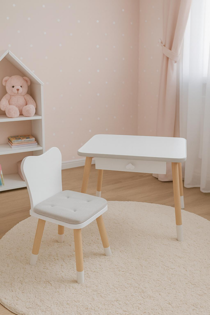 Дитячий комплект меблів з дерева: стіл з ящиком для зберігання та м’який стільчик із сірою окантовкою