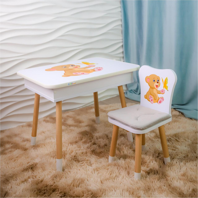 Набір дитячий стіл зі стільцем з подушкою пенал 1–7 років білий дерев’яний з наклейкою ведмедика