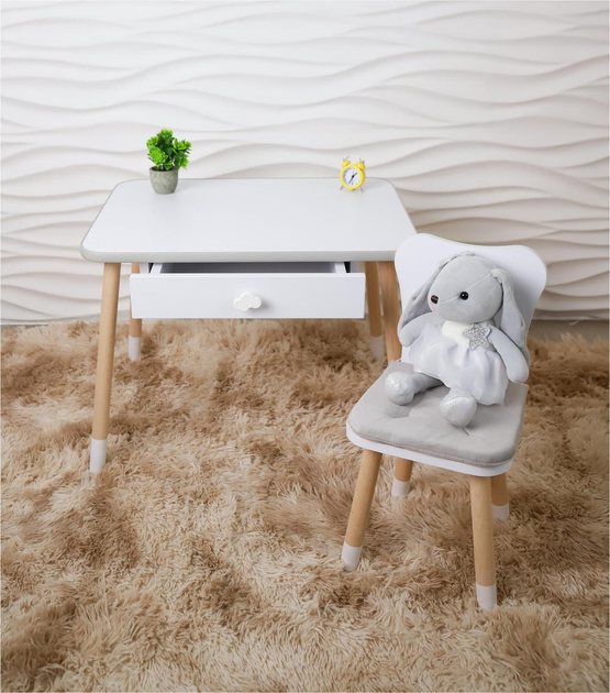 Дитячий стіл з шухлядою та стільчик 60х45 см дерев’яний білий набір для творчості,навчання із сірою окантовкою